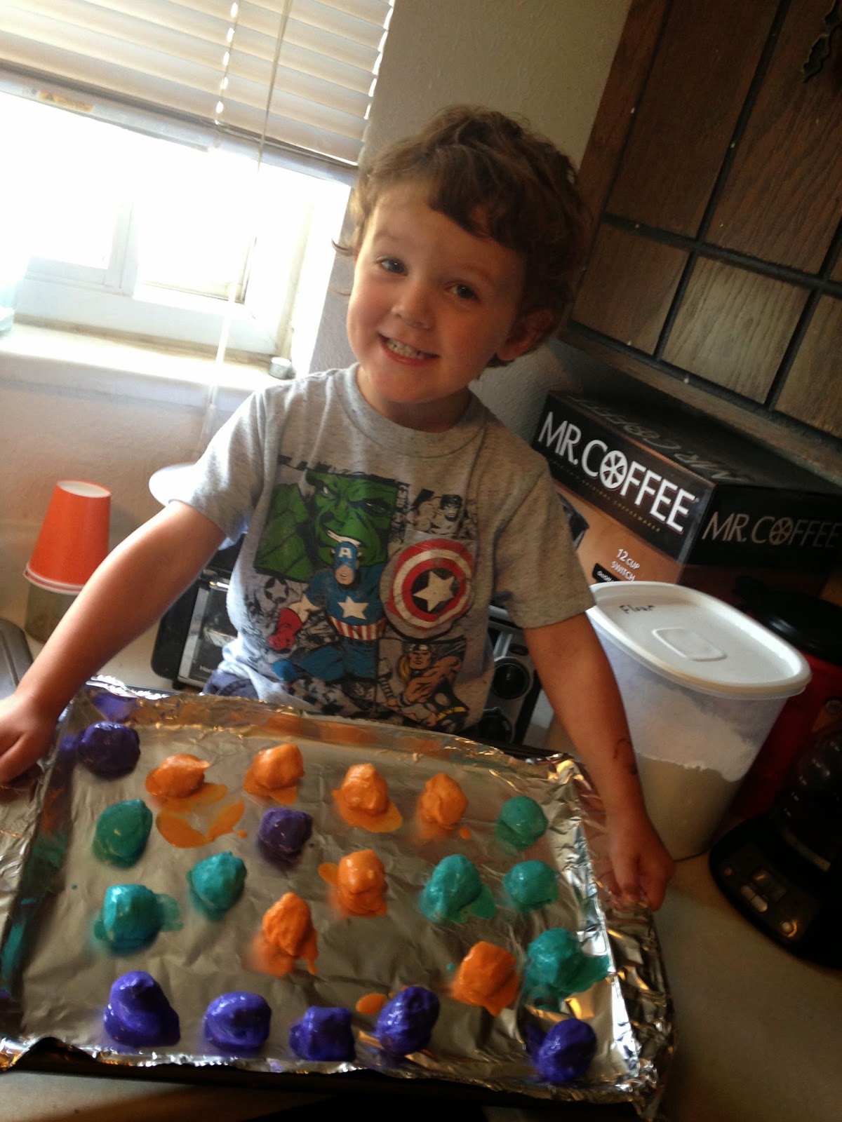 I spent some time organizing the junk drawer this week and in the process found some old eye droppers. Evin REALLY wanted to use them so I poured some baking soda on an old cookie sheet and filled a mini muffin tin with food coloring and vinegar water and let him go to town!
